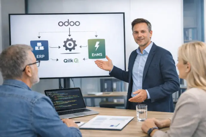 Odoo wird nahtlos in Ihre bestehende Systemlandschaft integriert. Daten aus ERP, BI (Qlik) und Energiemanagement (EnMS) fließen automatisch zusammen – ohne Medienbrüche.