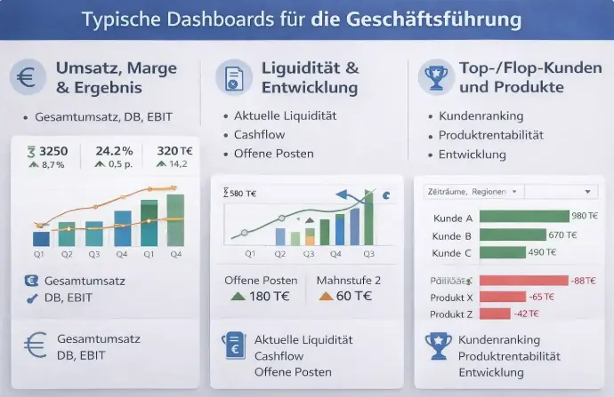 - Interaktive Dashboards für Geschäftsführung, Controlling und Fachbereiche